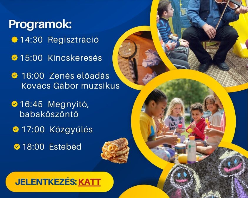 Családok napja 2026.05.16 Szerző: PSZNE | 2026. ápr 22. | Hírek | Nincsenek hozzászólások Családok napja 2026.05.16 Pécs, Szabó józsef utca 4 14.30 Regisztráció 15:00- Kincskereső 16:00 Előadás Kovács Gábor muzsikus 16:45 Megnyitó, babaköszöntő 17:00 Közgyűlés 18:00 est ebéd 15-18 között a kézműves folyamatosan van. Regisztrációs link kattints ide